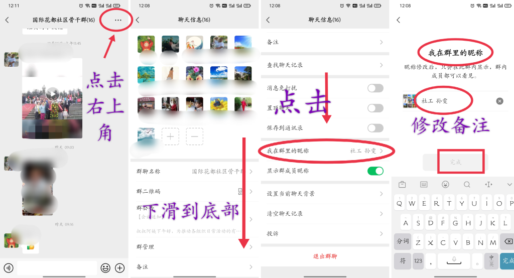 视频通话开始前,为了更好地熟悉社区骨干群内成员,方便交流互动,社工制作微信群内备注修改示意图,帮助群内成员修改自己的备注姓名,增进社区骨干群内成员之间的了解。
