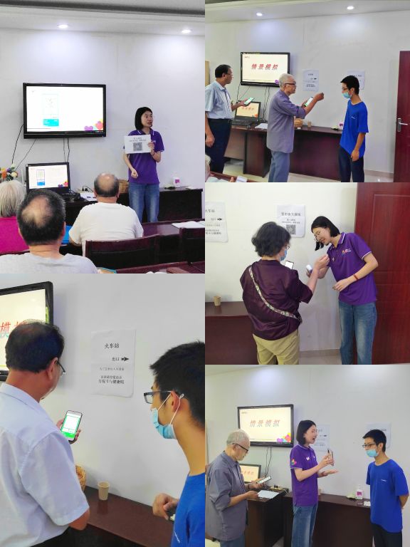 在正式开始本节课堂前,社工带领大家回顾了上节的学习内容,并通过“火车站”、“商场”这两种生活情景进行模拟,为老人提供了一次“实战演练”的机会,提高了老人们对健康码、行程卡的辨别与应用能力,也让老人们能积极地参与到课堂当中,在轻松愉快的互动中完成了本次的情景教学。