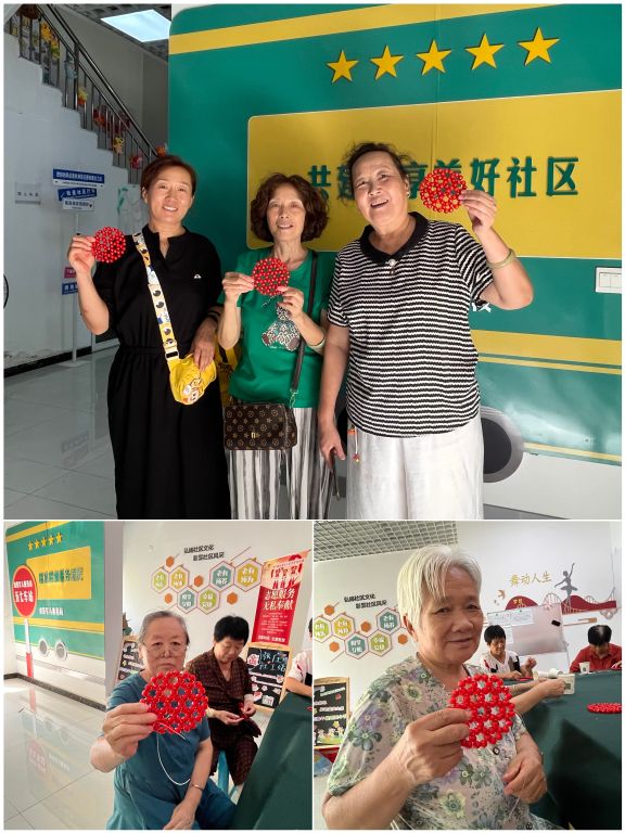 稍后进行的串珠手工中,社工带领小组成员进行“悦动指尖”的手指操练习,充分调动了手指的灵活性和手眼协调性。手指操为指关节的运动做了充足的准备,接下来大家飞线走珠,将学习过程中的难点通过互相交流讨论逐步攻破,不一会精致的串珠杯垫就跃然出现。大家分分感慨刚才还散落珠盘的各色彩珠,不一会就变成了精美的工艺品,真是成就感满满。