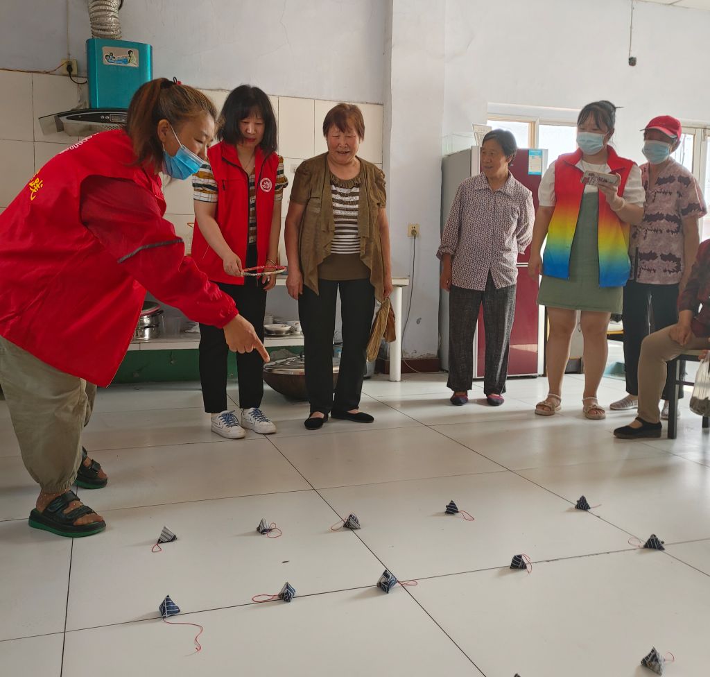趁着煮粽子的时间,社工们组织大家玩起了趣味十足的套圈游戏。“中了!中了!”活动室内充满了一阵阵热闹的欢呼声,老人们各显神通,热情高涨地相互比拼,大家其乐融融,笑声不断。游戏结束后,社工还为大家赠送香囊一枚,寄托端午节驱邪避灾的美好祝愿。