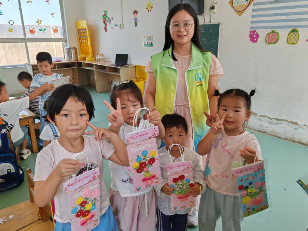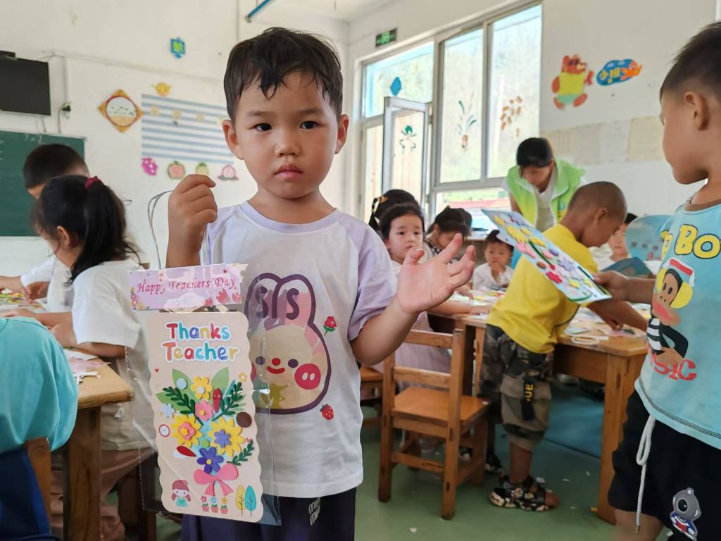 孩子们开心地捧着自己亲手制作的花束共同送给了自己的老师,并对老师说“老师,您辛苦了,教师节快乐……”一句句饱含祝福和感激之情的话语表达了孩子们对老师的深深敬意。