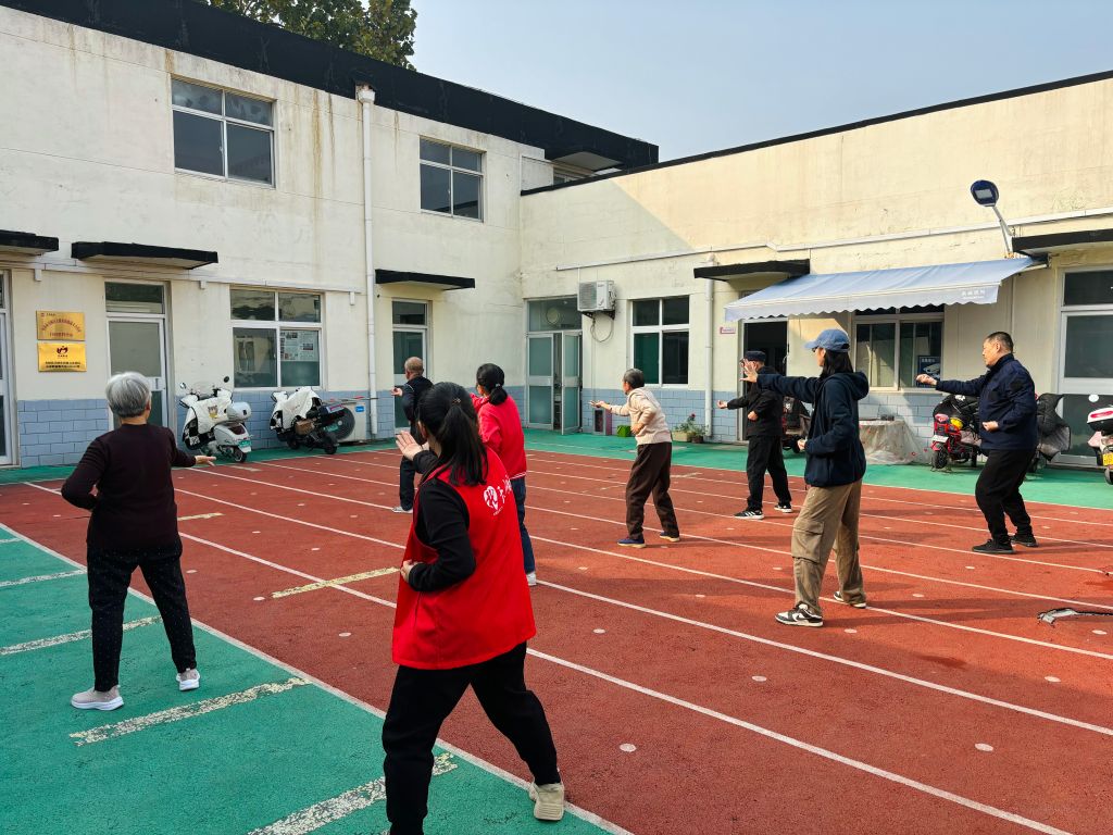 活动伊始,社工向老人介绍了八段锦对于身心健康的诸多益处,点燃了大家的学习热情。在基本动作练习阶段,志愿者老师将每个动作拆解开来,详细讲解和示范。随着舒缓的音乐和老师的口令,老人们整齐列队、积极学习,“左脚开步”“意守丹田”“双手托天理三焦”……尽管一开始动作略显生疏,但每个人都认真专注,感受八段锦带来的身心愉悦。