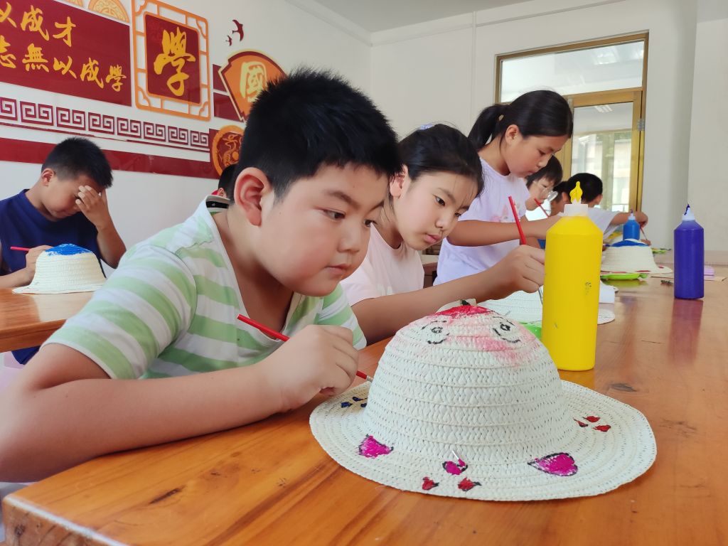 欢迎来到孙耿街道社工站的彩绘世界。小朋友们都拿到了自己的画笔和颜料勾兑颜料,根据自己对农耕文化的理解都发挥自己的想象力,从设计到创作,都是小朋友自己动手,一点一滴画出来的。他们把对农耕文明的理解融入到了作品当中,原本简易单调的小草帽在小朋友们的创作下,赋予了新的生命。此次活动,不仅让孩子们学习了农耕文化,增长了艺术知识,增强了孩子们的动手能力。同时,也搭建了孩子们对艺术与传统农耕文化的学习交流平台。