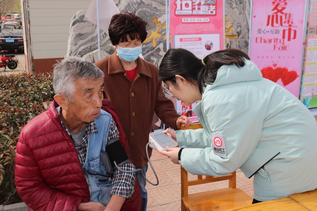 其次,社工为到场群众提供了免费测血压、测血糖等服务,并耐心地解答群众提出的各种问题。活动现场热情高涨,吸引了一批又一批前来咨询的群众。