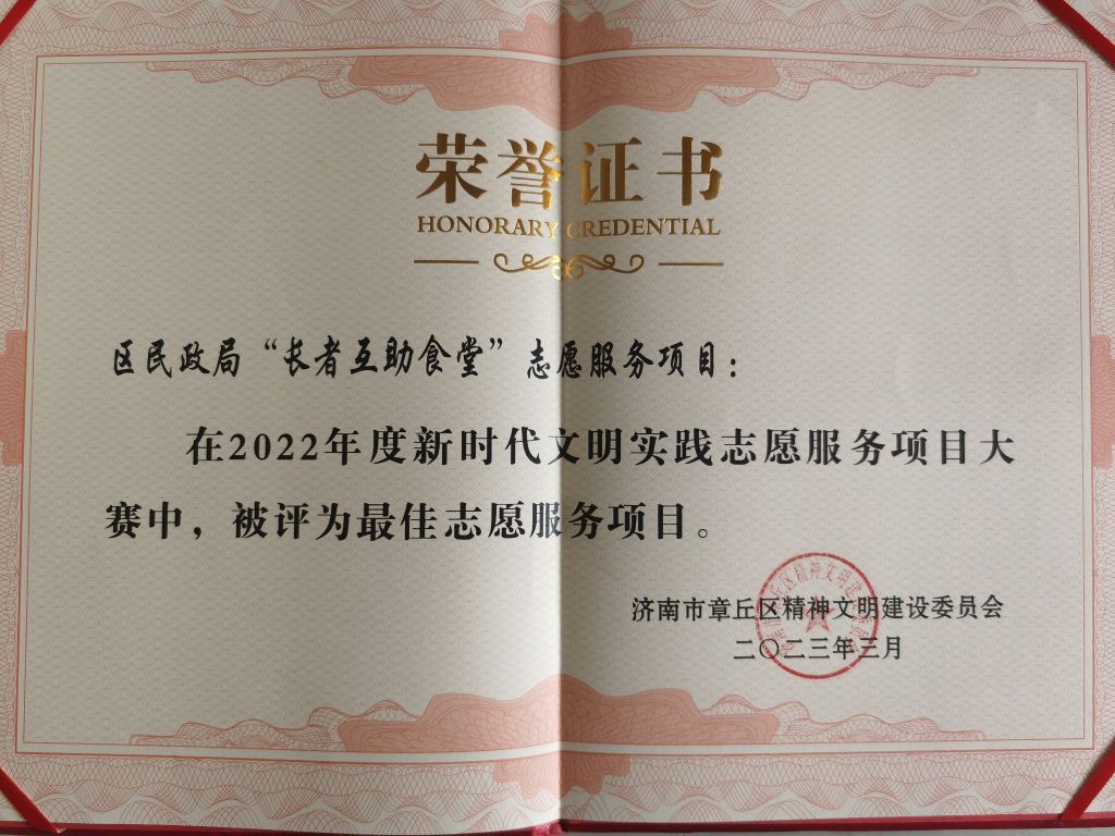 3月4日上午,由区委宣传部主办的“3·5”学雷锋志愿服务活动暨新时代文明实践志愿服务项目大赛启动仪式在明水街道查旧村广场举行。现场表扬了2022年度学雷锋志愿服务先进典型,并为最美志愿者代表、最佳志愿服务项目暨文明实践志愿服务大赛获奖项目代表颁奖。由章丘区民政局安排部署,区两级社工站具体组织实施的“长者互助食堂”志愿服务项目荣获“最佳志愿服务项目”奖项。