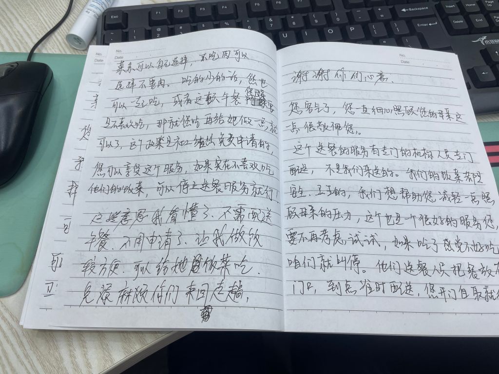 在服务中,社会工作者观察到服务对象虽然重度残疾,但是家中环境干净整洁,92岁的母亲衣着干净身上也无异味。看的出来服务对象对生活的态度是积极向上的。服务对象和社会工作者通过纸笔交流,本次服务社会工作者主要宣传政府居家养老的政策,通过链接政策可以缓解每天的照顾压力,提供一定的喘息服务,让服务对象得到一定休息。