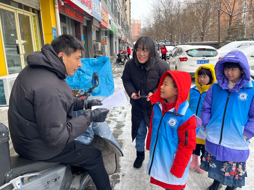 随后,社工与城管队员重点向青少年们普及了垃圾分类知识,通过知识问答和垃圾分类大富翁的游戏,让青少年对于四大类垃圾的定义和种类有了更为深刻的理解。经过简单了解及学习后,青少年们踏上了职业体验之旅,冒着凛冽寒风和漫天大雪,随社工与城管队员走访了辖区内的商户,宣传“门前五包”,带动辖区商户积极清理积雪,商户们纷纷表示积极配合青少年们的宣传,一起守护美好的社区环境。