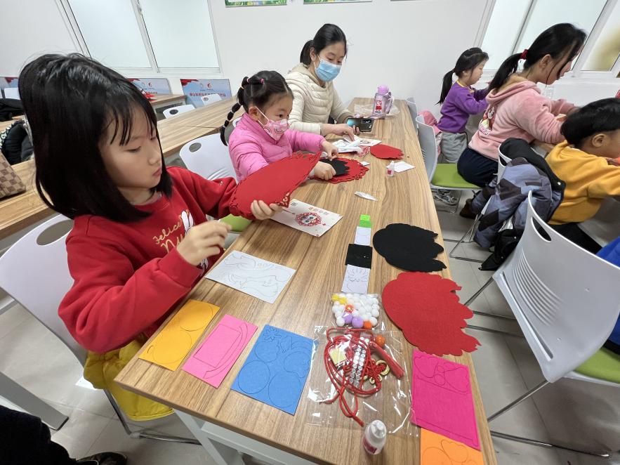 随后,社工带领大家亲手制作龙年春节挂饰,在社工的引导下,孩子们细心地剪裁、粘贴、拼接,一个个色彩斑斓、形态各异的龙年挂饰在手中逐渐成形。