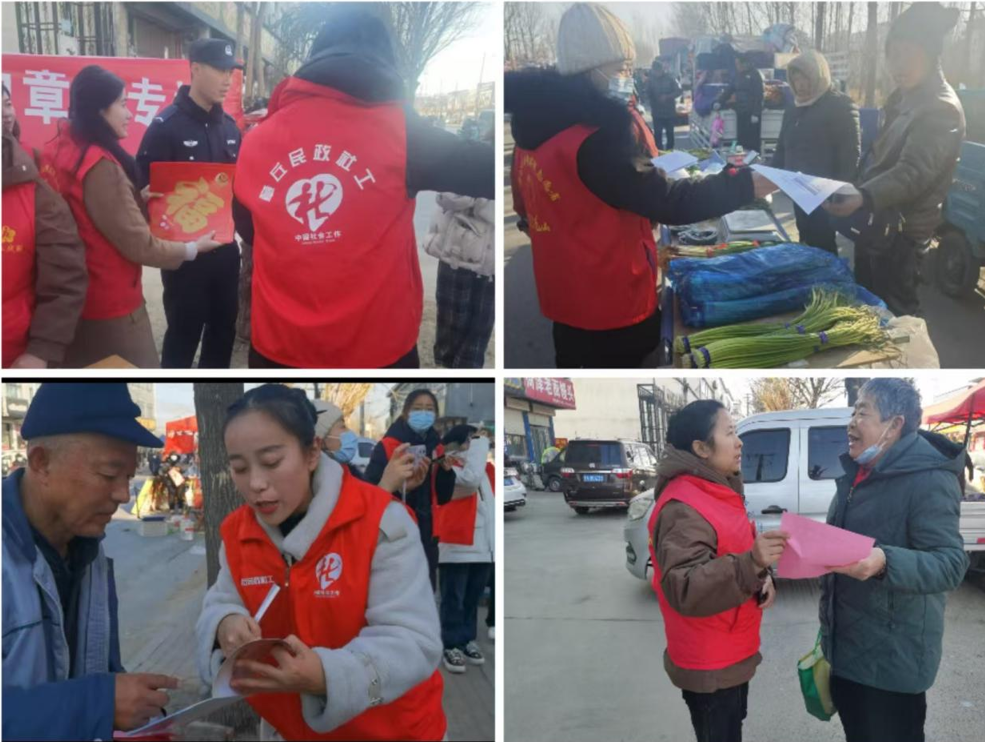 志愿服务汇集市,文明和谐过新年。为倡导辖区居民共度一个文明节俭、健康祥和、安全暖心的新春佳节,高官寨、龙山街道社工站联合多部门,在大集上开展了一场别开生面的文明志愿服务活动。高官寨街道社工站的社工和志愿者们在大集上向过往群众发放《移风易俗过春节倡议书》,宣传移风易俗新观念,提倡居民在春节期间摒弃大吃大喝、铺张浪费、互相攀比等不文明不健康的过节陋习,倡导节俭文明、健康和谐的节日新风。黄河大集上人头攒动,熙熙攘攘,龙山街道社工站的社工和志愿者们向居民普及法律、消防、环保、反诈等知识,切实提升群众防范安全意识,共同为百姓的春节安全保驾护航。