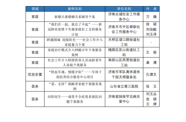 为激发和鼓励我市社会工作专业人才提高自身专业素养和实务能力,进一步总结提炼社会工作服务经验与模式,积极推进我市社会工作服务行业专业化发展和社工站建设。在济南市民政局的指导下,济南社会工作协会开展了济南社会工作服务案例征集活动。活动共征集案例97个,经过社会工作相关领域专家进行评审,确定47个案例入围,现将名单公示如下: