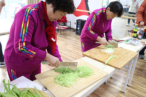 一大早,社工和居委会工作人员就将活动所需的材料物资清洗干净摆放就位,不一会儿,社区活动室俨然变身成了社区厨房。居民们纷纷来到活动室,把桌子临时拼凑成的操作台,大家纷纷“抢占”自己的一席之地。有的在和面,有的在切菜,还有的在调肉馅,一片欢乐祥和的气氛。