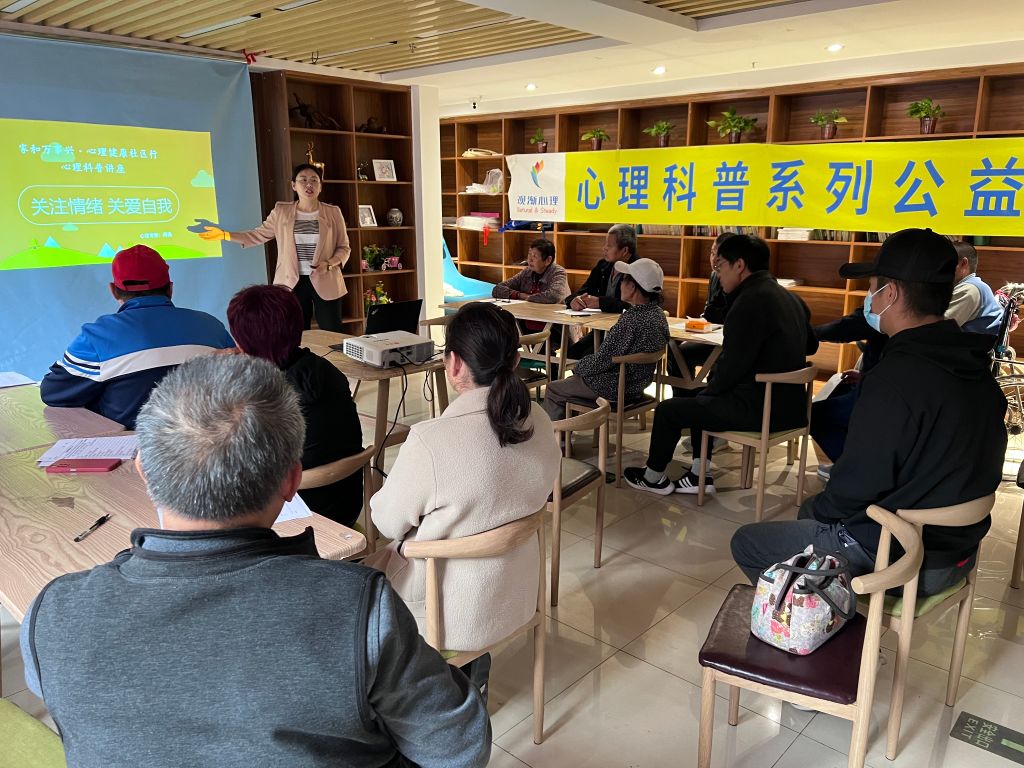 活动邀请观渐心理咨询机构周逸老师做讲座。活动中,街道社工站社工为残障人士及其家属分发信息登记与心理筛查表,主要围绕如何识别抑郁情绪及临床表现、做好自我关爱等话题展开交流。周老师通过PPT讲解、小游戏、案例分析相结合的方式,用浅显易懂的语言为他们传授心理健康知识以及心理疏导的基本方法和技巧,与他们积极互动,解答提出的问题,大家纷纷表示受益匪浅。