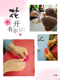 丝网花,最早起源于日本,被当地人称之为东篱花,由于制作丝网花的基本材料是普通的丝袜,也被称为“丝袜花”。看花容易,绣花难,这些“小花”们各个心灵手巧,左转一下,右捏一下,不一会花瓣就成型了,看着一朵朵栩栩如生的丝网花从她们手里诞生,那种欢喜感溢于言表。你看,阿姨们全神贯注的模样、神采奕奕的笑脸,节日里充满了欢乐的气氛。