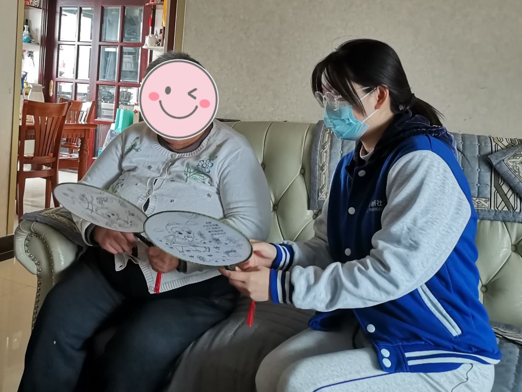 联动多方力量,提供多元服务。社工带领“幸福喘息”流动志愿服务队来到服务对象家中,提供全方面、近距离的支持。在喘息服务过程中,社工运用同理、聆听、鼓励等专业技巧,对照护者进行压力识别与评估,同时更新其动态变化需求;居民志愿者为困难群体家庭打扫卫生、整理家务,让照护者“放个短假喘口气”,缓解日常疲惫;社区社会组织成员通过自己擅长的手艺为服务对象解压赋能,共同制作扇面画、花束等手工艺作品摆放在家中,使其足不出户就能参与到社区教育课堂。在志愿服务队的合力协作下,服务对象露出了轻松欢快的笑容。