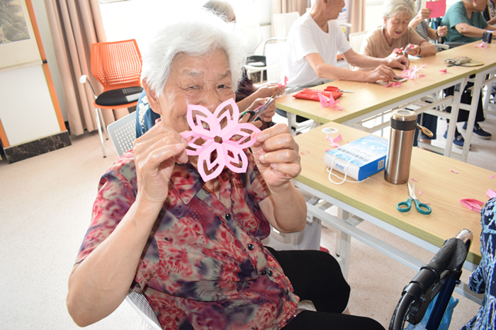 一张张彩色的纸,一把把小小的剪刀,碰撞在一起就会有无数种好看的图案。活动伊始,贾奶奶用手中的剪刀剪了一个六角花瓣,社工和志愿者一起帮其他老人一起完成这个六角花瓣。志愿者们也准备了好看的剪纸,分享给老人图案的剪法。大家相互交流、相互学习,时间总是过的很快,桌子上已经摆满了大家的成果,老人们举起已经完成的作品,满是自豪。志愿者们耐心、细心,他们的笑容更是感染着每一位老人。最后志愿者们还精心准备了手指操,以防止老人长时间拿剪子,手出现麻木的情况。