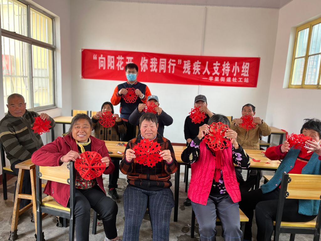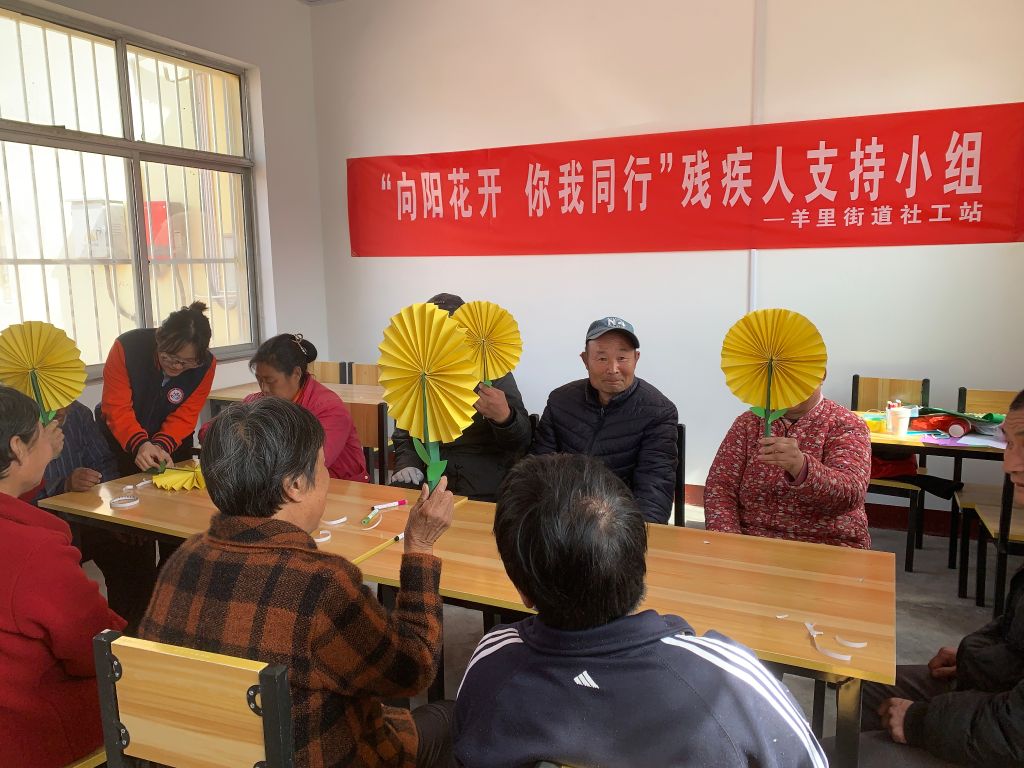 为了让辖区内残障服务对象提升自我效能感,增强他们的社会参与和社会融入,建立团结互助的支持网络,并感受到邻里和社区的关心关怀,羊里街道社工站在仪封村日间照料中心开展“向阳花开,你我同行”残疾人支持小组活动。在小组活动中,社工和志愿者与10名组员共同完成了5节小组活动。