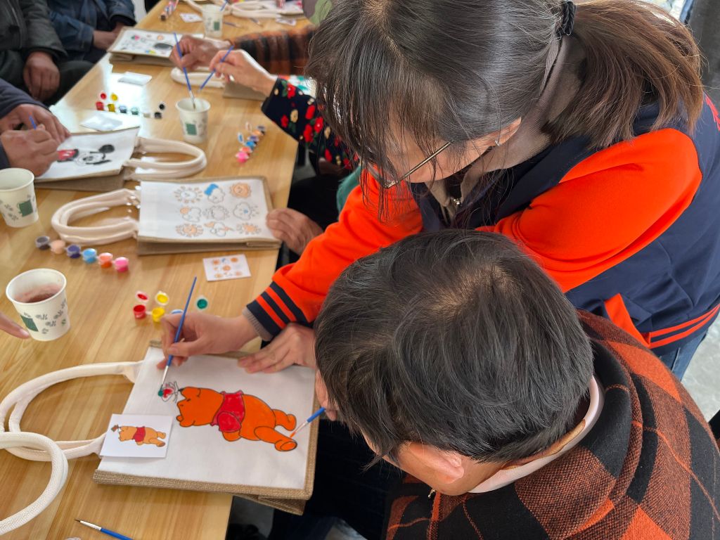 社工让组员挑选喜欢的帆布包图案,对帆布包开始涂色,有为组员学的比较快,旁边的李阿姨由于是第一次绘画,加上年龄大点、视力不太好,看不清色号,组员总是热心的帮忙。小朱因为智力障碍,不能完全领会老师的意识,但也开心地拿起笔,按照自己地理解进行图色,并询问自己做的对不,组员都给以积极的肯定和鼓励。