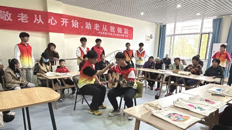 绘画完成后,志愿者为老人们进行才艺表演。伴随着吉他弹唱的优美旋律,现场充满欢声笑语,洋溢着温馨、和睦的氛围。