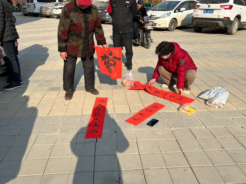 文化站及社区的书法爱好者们汇聚一起,挥毫泼墨,共同书写春联和福字,一副副功力深厚、艺术风格迥异的春联、红红火火的“福”字都代表着对群众的新春祝福,也让大家切身感受到春节的临近及年味的浓郁;同时,书法爱好者们还从字体、笔画、结构等方面为群众讲解书法的基本知识及如何欣赏书法作品,邀请群众共同书写体验,亲身感受书法的魅力,进一步丰富群众文化生活,传承文化精髓,冬日阳光下一幅幅写满新年祝福的春联,写的是汉字,暖的是人心。