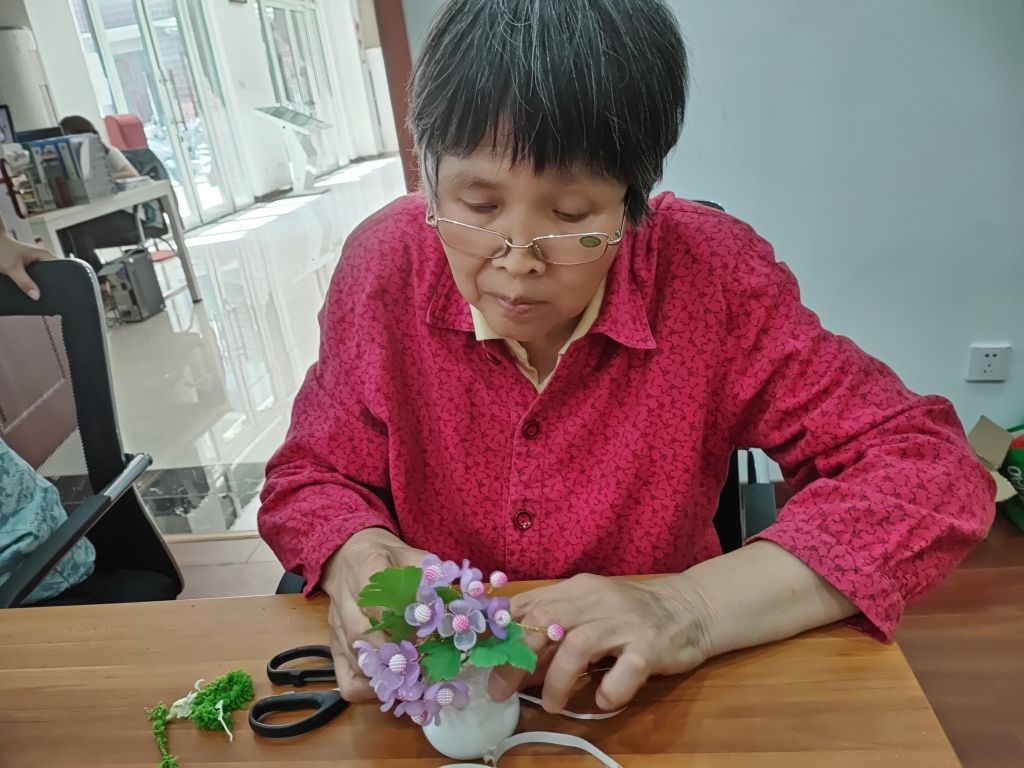 活动伊始,社工向志愿者阿姨们讲解了母亲节的由来以及中国的孝道文化,阿姨们听得津津有味。然后,社工向大家介绍绣球花手工DIY的技巧,还没等社工讲完,有几位阿姨就迫不及待地动起手来。由于部分材料较小,操作起来稍有困难,有位阿姨在那里责怪自己年老眼花,手在哆嗦不听使唤,社工发现后,耐心地指导并提供帮助,鼓励阿姨不要着急、慢慢来,及时地消除了阿姨的负面情绪。在欢声笑语中,一束束漂亮精致的作品"新鲜出炉",阿姨们互相称赞着对方的作品:“太漂亮了!真好看!”现场洋溢着欢乐的气氛。