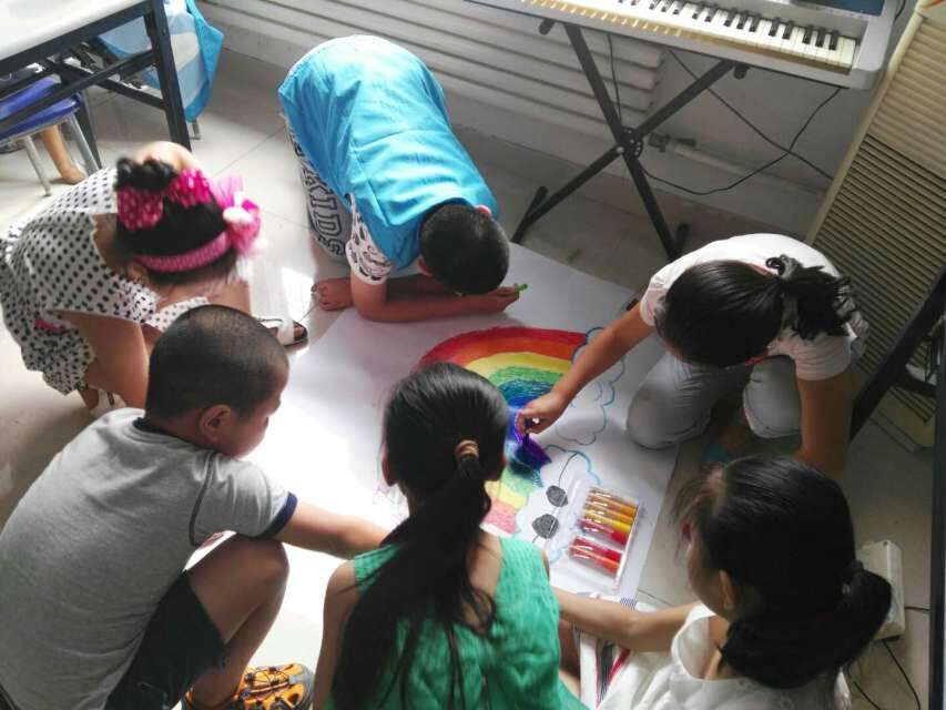 下午两点,活动正式开始,在社工的引导下,儿童进行了规则的制定,包括不迟到,不打闹,认真投入到活动中等,社工也制定了相应的激励措施,对表现好的儿童发放奖励卡,奖励卡分为三种,包括遵守秩序、主动参与和精彩表现;随后,儿童在社工的带领下,进行了破冰游戏乌龟与乌鸦,在游戏最后由儿童提议,进行萝卜蹲游戏,社工将儿童分为两个组,每组自行进行,组员们积极参与,红萝卜、紫萝卜、蓝萝卜……,不一会活动室内变成快乐的海洋,通过破冰游戏,大家增进了相识度。最后,以两个组为基础,大家在纸上描绘出小组名称、小组标志和小组口号,大家共同构思,创意无限,二组组员利用萝卜蹲中每个人代表的颜色创作出七色彩虹,名字叫做彩虹队,这种创意也让社工由衷感到欣慰,每个孩子都有潜力。