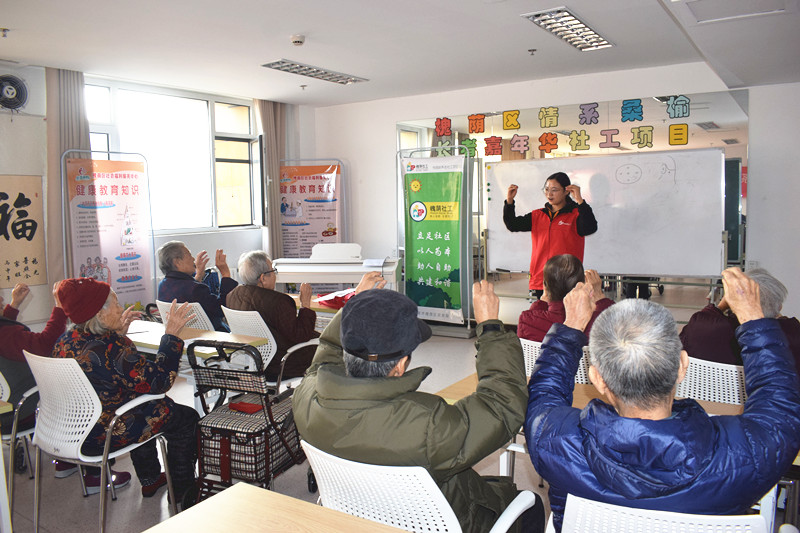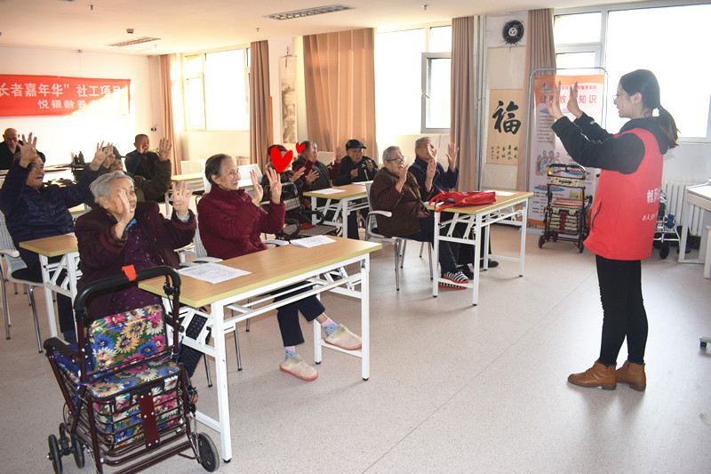 上午九点,老人准时来到老年大学,社工向每一位参加的老人发放了准备好的讲义。在活动开始前,社工带领老人一起做了“数鸡蛋”的手指操,通过手指操可以集中老人的注意力、活跃课堂气氛、为老人的学习增添乐趣。课堂上社工先向老人简单介绍了失眠的分类,接着从日常生活、饮食、穴位按摩、冥想等四个方面向老人介绍了改善失眠的方法。老人们在认真听的同时纷纷发表了自己的看法,几位老人还以自己的亲身经历举例说明。活动结束后,几位老人坐在座位上与社工讨论了有关失眠的话题,一位老人赞道:“开这种课非常有用,老人们都需要多学一些健康知识!”
