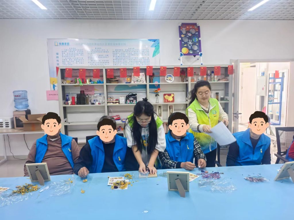 在手工制作环节,残疾朋友们展现出了令人钦佩的专注与创造力。在社工的耐心指导下,他们小心翼翼地将干花一朵朵粘贴在相框上,每一朵花的摆放都经过精心构思,每一笔色彩的搭配都流露出他们对美的追求。虽然他们的动作可能不如常人那样敏捷,但他们的眼神中闪烁着对生活的热爱和对艺术的执着。在他们的巧手下,原本普通的相框逐渐变得生动起来,仿佛每一朵干花都在诉说着一个关于坚持与希望的故事。