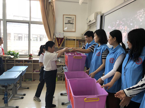 通过播放宣传视频的方式,向同学们介绍了贫困儿童生活、学习环境,观看视频后,孩子们纷纷将自己带的书籍、衣服递到社区志愿者手中。在师生的踊跃参与下,共捐得书籍500余本、衣物200余件。下午,在奥体西苑社区党委芦泳书记的带领下,奥体西苑社区工作人员及志愿者将所捐的物资送到和苑社区。