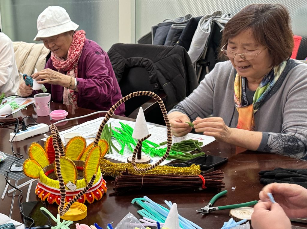 活动在温馨而热烈的氛围中展开,五彩斑斓的扭扭棒成为了主要材料。社区志愿者徐老师一边讲解,一边用扭扭棒演示制作过程,组员们也巧妙地将扭扭棒弯曲、缠绕,随着一棵棵智慧树的完成,活动现场气氛达到了高潮。组员纷纷将自己制作的智慧树挂在指定的区域,形成了一道亮丽的风景线。这些智慧树不仅展示了大家的创意与才华,更寓意着老人智慧的传承与发扬。
