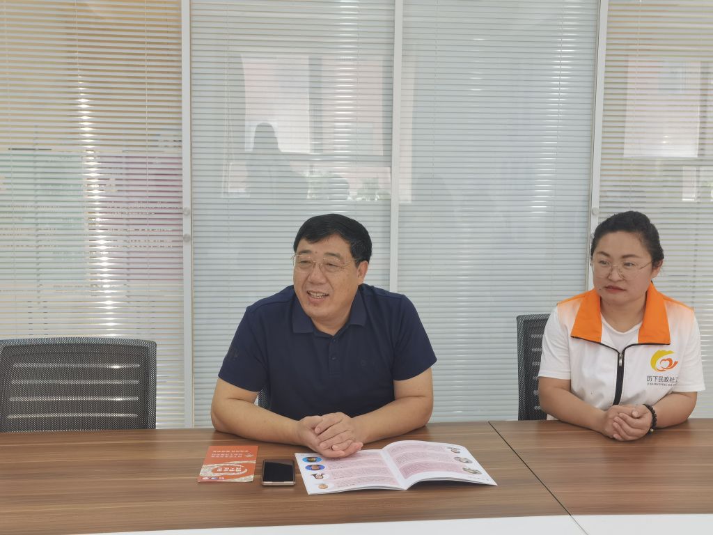 调研组一行听取了东关街道社工站老年社会工作的发展历程及现阶段服务开展情况,重点了解了“情系桑榆,大爱泺河”老年人社区参与项目、“泺忆家”认知症友好社区建设项目、“忆相伴”认知症家属赋能项目等特色服务品牌。总干事李明叶向调研组详细介绍了“五社联动”机制下老年人认知障碍友好社区建设流程,对认知障碍领域服务对象分类、服务分层的具体操作方法作出解读,并介绍了《认知症老人照护小贴士》、黄手环等品牌宣传品。