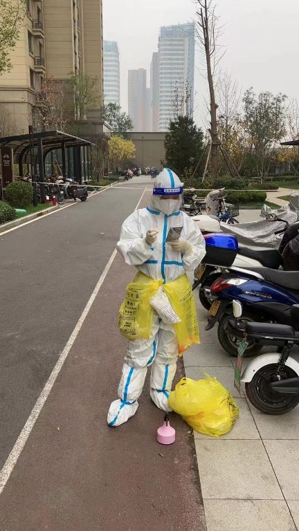 早上八点半,社工准时出现在万东社区服务中心,穿防护服,戴手套、面罩......社工很快就变身大白,然后开始领取当日防疫任务。上午的任务是去封控楼栋入户为居民做核酸,“鞠老师你去18号楼,代老师你去17号楼,孙老师......”听到命令,社工立马在腰上绑上两只黄口袋,一边装上待检人员名单、录信息的手机,一边装好检测试管,协同医护人员马不停蹄赶往目标楼栋。