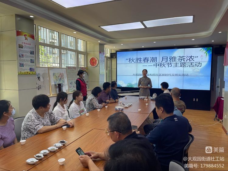 在中秋佳节来临之际,2022年9月6日下午,大观园街道社工站联合睦和苑社区召集辖区志愿者开展“秋胜春潮、月雅茶浓”中秋节主题活动,邀请臻舍茶社的老师和古琴老师一起共度中秋。在活动刚开始,由古琴老师为大家琴奏曲子,并讲解曲目的由来,大家纷纷鼓掌,称赞老师的琴艺。