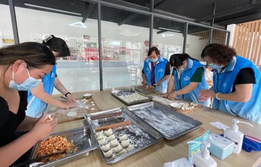一大早,日间照料中心工作人员就开始准备水饺馅和面团,日间照料中心俨然变成了社区厨房,志愿者和社区老人聚在一起,大家有揉面的,擀皮的,拌馅的,包饺子的,互相切磋着手艺,时不时地交流各自的技巧,个个动作娴熟。在大家的协力合作中,很快一排排形态各异的饺子就摆满了盘子,志愿者一边包水饺一边陪老人们拉着家常,倾听她们发生过的趣事,现场欢声笑语,温馨欢乐。