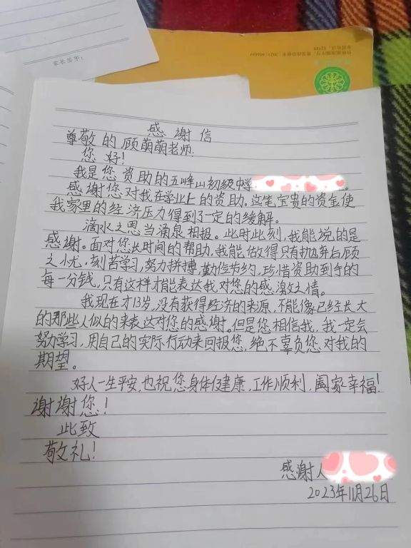 2023年11月,新新为表自己内心的感谢,给萌萌老师写了一封感谢信,委托社工站制作捐赠证书给萌萌老师送去,留作纪念。萌萌老师收到感谢信后非常感动:“不用谢,我尽自己最大力量,让你的生活好一点就满足了,希望你能好好学习,把这份爱心传递下去。”