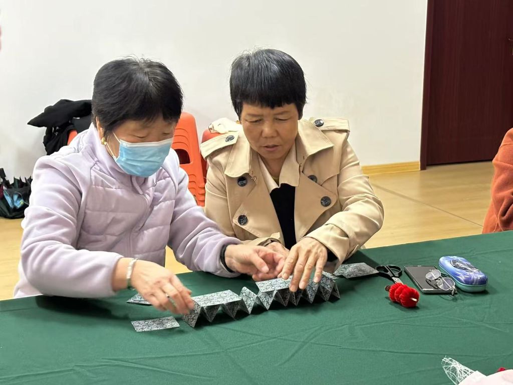 社工与志愿者们首先组织开展了一项名为“纸牌塔”的游戏,大家两两一组,通过协作把手中的纸牌堆成高塔。现场活动气氛活跃在一片欢声笑语中使小组成员之间的关系变得更加紧密。