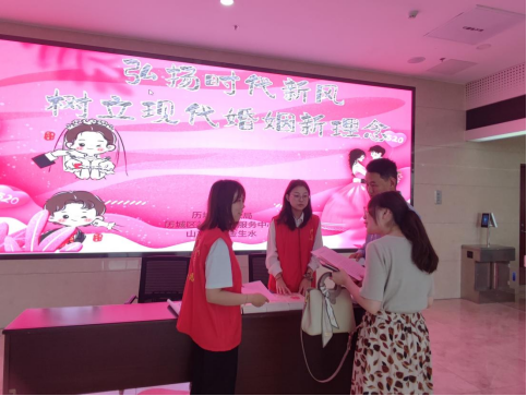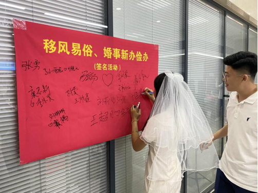在登记现场分为预约类、非预约类两支队伍,前来登记的新人自觉排队等候。总站社工做好现场引导、秩序维持等工作,确保婚姻登记工作安全、有序、顺利进行。此外,历城区婚姻登记处开展“移风易俗、婚事新办俭办”签名活动,总站社工协助引导新人们进行签名,进一步增加了婚姻登记的仪式感。