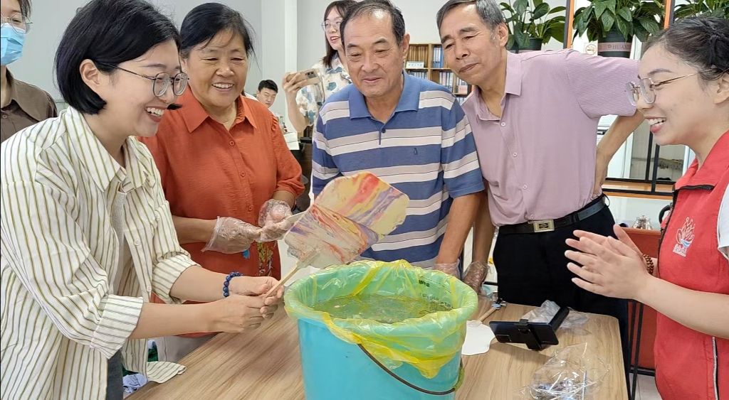 紧接着,活动进入手工制作漆扇环节。漆扇是中国传统文化中的瑰宝,通过亲手制作漆扇,老年朋友们不仅能够体验到创作的乐趣,还能够感受到传统文化的深厚底蕴。在正式体验前,社工首先向大家讲解了漆扇的历史和文化意义,并示范了漆扇的基本制作技巧,让大家对漆扇有了更深入的了解。随后,在社工的指导下,大家纷纷动手体验,按照个人喜好调配颜色,将各种漆料巧妙地融合在水中,染色于扇面上。从扇面处理到漆料的调色、上色,不时传来阵阵掌声和赞叹声,大家相互学习、交流经验,共同体验传统文化的魅力。