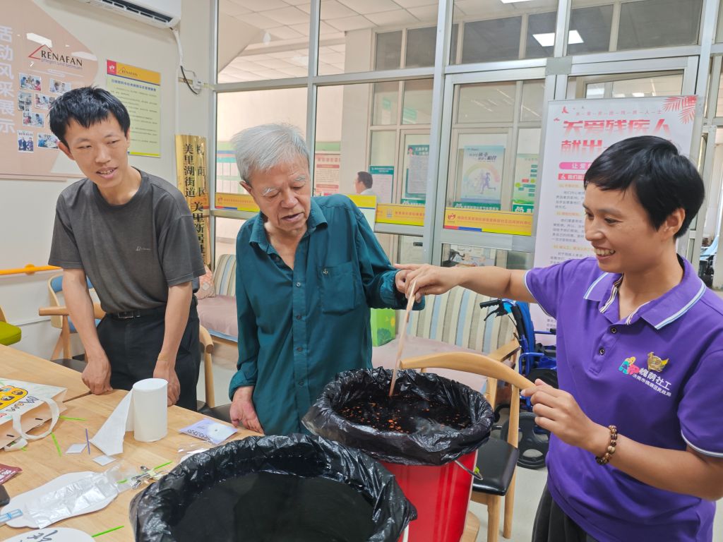 首节课程由经验丰富的社工指导,社工不仅详细讲解了漆扇的历史背景和制作工艺,还手把手地教授了每一步骤的具体操作方法。在社工的指导下,参与者们兴致勃勃地投入到漆扇的制作中,从调配颜色到上漆技巧,每一个环节都充满了创造的乐趣。随着一幅幅精美如画的漆扇呈现在大家眼前,残疾人们也从一开始拘谨放不开逐渐喜笑颜开,连连点赞。