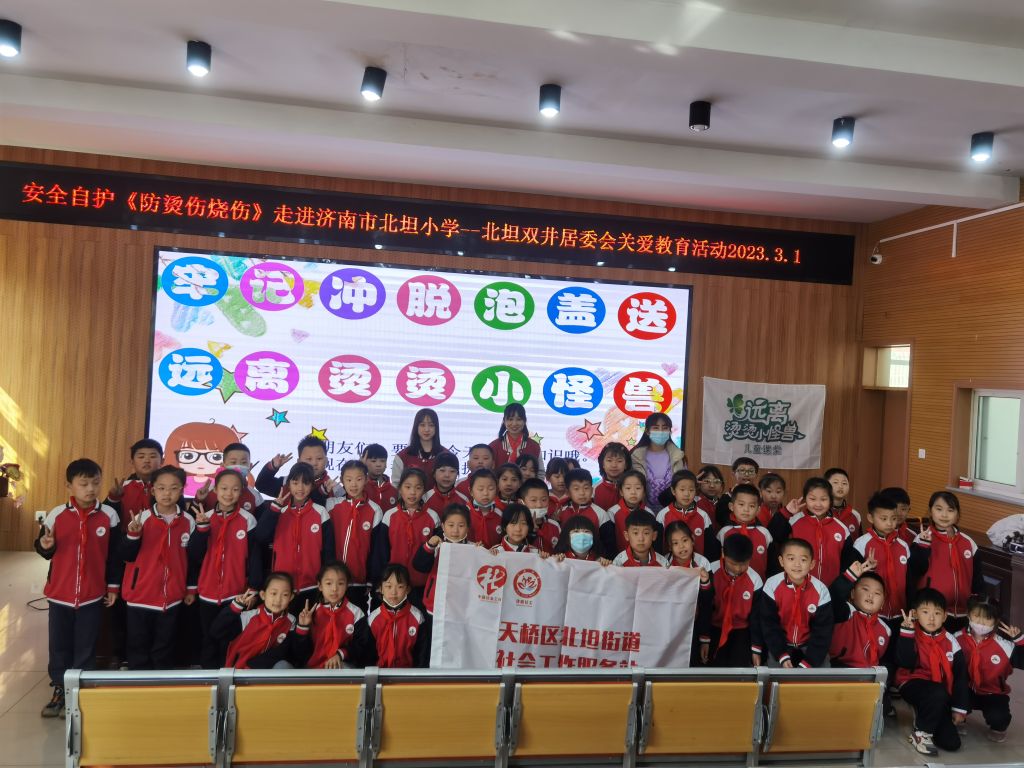 为提升孩子们预防烧烫伤的安全意识和烫伤急救能力,切实保护孩子们远离意外伤害,同时进一步推进北坦街道社工站“温暖阳光”关爱特殊困难群体服务项目,共筑儿童健康成长堡垒,2023年3月1日,北坦街道社工站联合双井社区,将“烫烫小怪兽”领进北坦小学,为孩子们开展一场防烧烫伤安全教育宣讲活动。