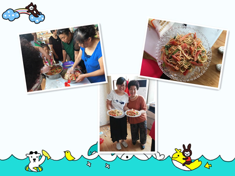 社工组织组员签到后,与大家一起回顾了小组契约,以规范活动秩序。结合老年人饮食控制高血压的主题,社工引导组员分享了日常饮食中控制高血压的食物,如经常吃的芹菜、木耳、花生等等。轻松愉悦的分享氛围,活跃了现场的气氛,活动在一片欢声笑语中正式开始。首先,社工播放了适合老年人吃的控制高血压的鸡肉杏鲍菇的制作视频。随后,社工带领组员回忆了鸡肉杏鲍菇的制作步骤,各位组员积极发言补充,同时分享了自己做杏鲍菇的秘密。学习完鸡肉杏鲍菇之后,社工鼓励组员一起制作了蔬菜拌面,洗菜、切块、搅拌、装盘,大家忙的不亦乐乎。
