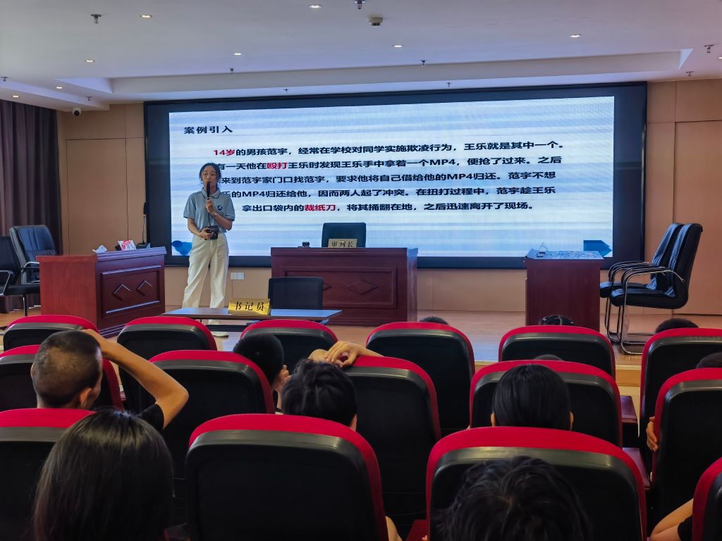 讲座中志愿者开展模拟法庭,通过受害者、施暴方、旁观者、以及家庭、学校、社会等多个角度,深刻揭示了校园欺凌造成的严重危害和影响,以学生的角度出发讲述面对校园欺凌的正确解决方式。同时讲述发生的真实案例,引导学生提高防范意识,学会自我保护,运用正确的法律手段来维护自己的权益,避免违法犯罪行为,坚决抵制校园欺凌,要做到知法,懂法和守法。