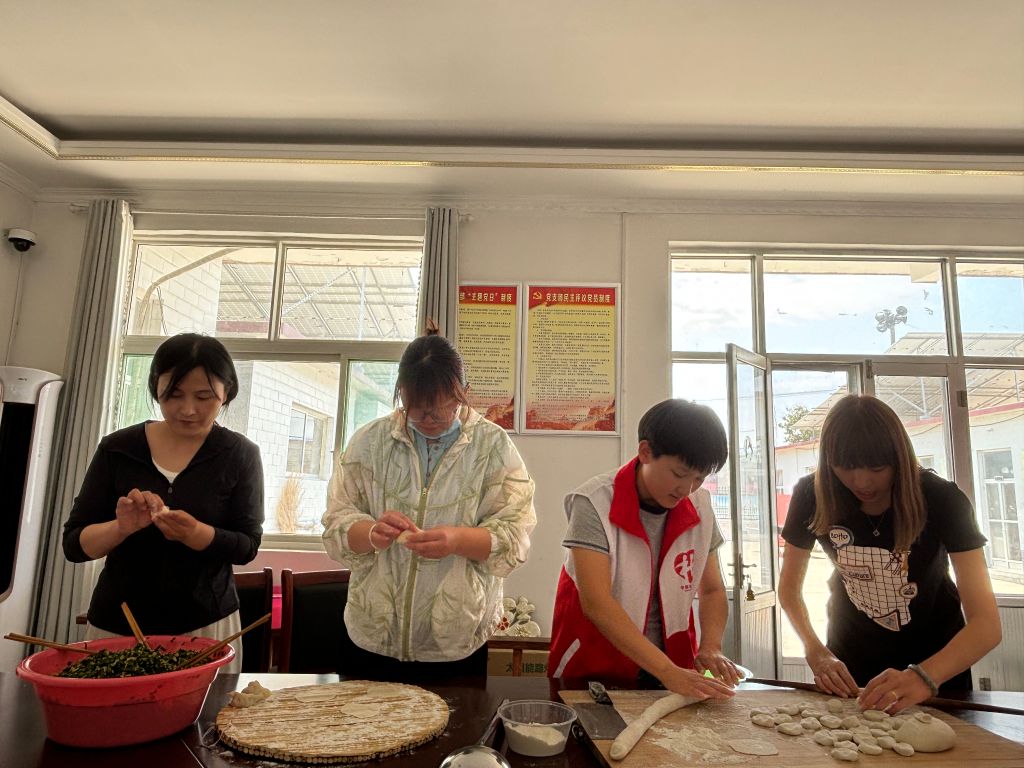 一大早,社工便带着各种食材和工具来到了东辛村的活动场地,大家迅速投入到包饺子的准备工作中。大家一边忙碌地揉面、擀皮、拌馅,一边与村里志愿者和村书记聊起了家常,气氛十分融洽。