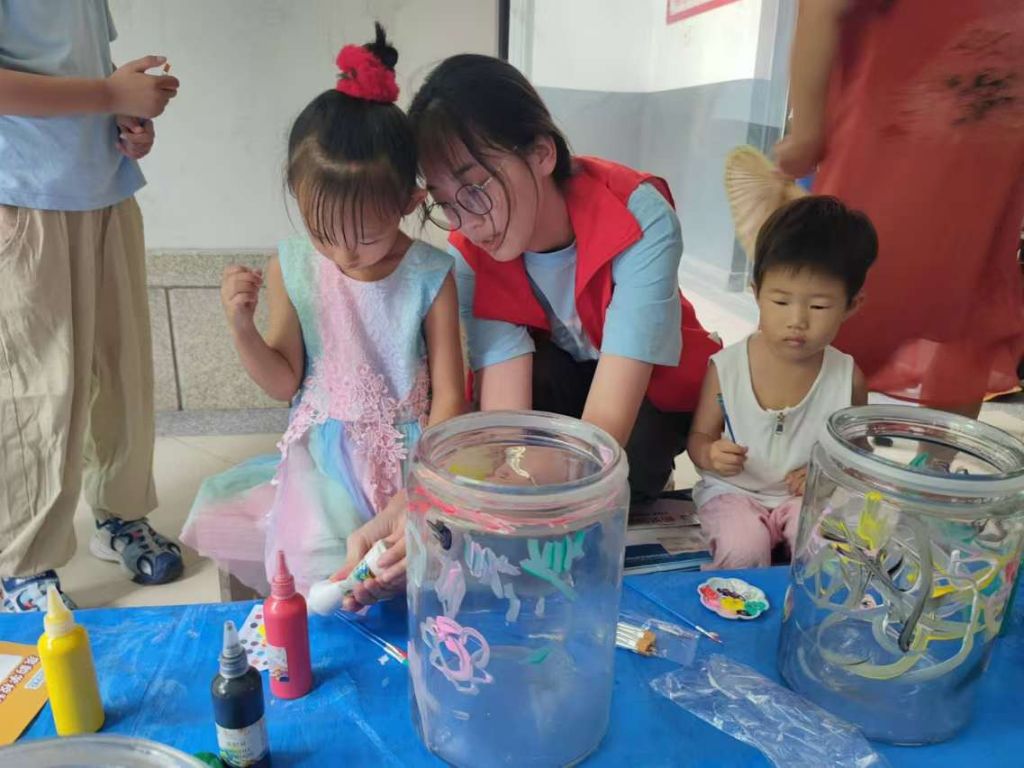 活动开始,社工认真向小朋友们讲解绘画技巧以及绘画中的注意事项。在社工的引导和鼓励下,孩子们充分发挥自己的想象,用画笔表现自己的想法,大家挥动着手中的画笔,用新奇的构思、大胆的设想,在玻璃罐涂上缤纷的色彩,在纸上绘制梦想蓝图。不一会,鲜艳的花朵、彩色的城堡、美丽的校园便跃然纸上,孩子们欣赏着自己的绘画作品,露出了充满成就感的笑脸。社工们将孩子们的绘画作品收集起来,设置“梦想明信片”,孩子们可以将梦想写在卡片上作为纪念,打造“作品展示区”、“梦想墙”,供小区居民观赏,增强社区的文化氛围。