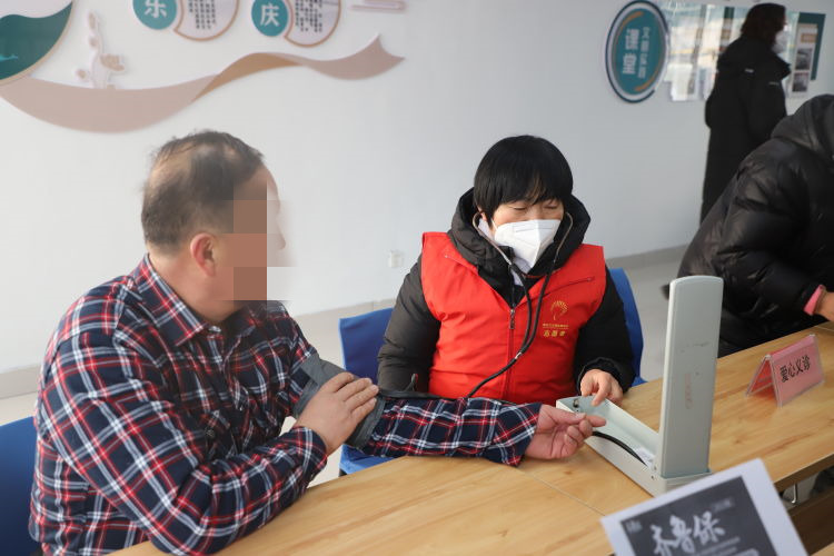 爱心义诊的志愿者为前来的群众提供义诊服务,量血压的同时解答他们在健康方面的疑问,为他们讲解冬季保养注意事项。还有部分群众正饶有兴趣的听志愿者介绍村内自行种植加工的草莓、蒲公英茶等特色农产品。