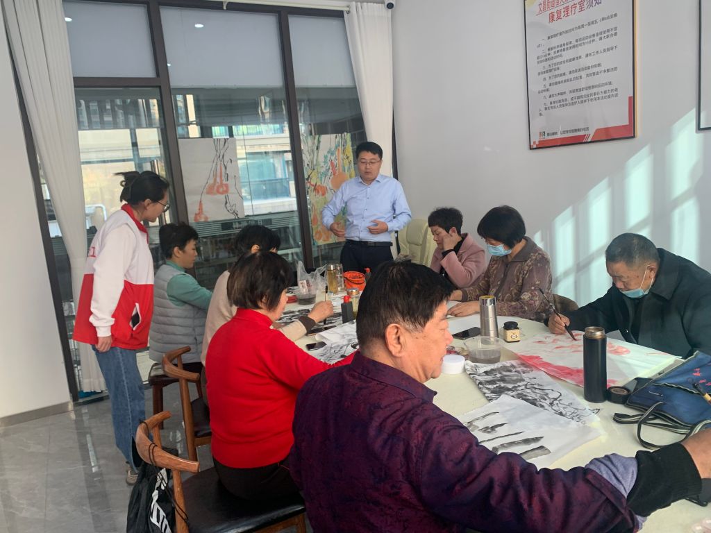 活动中,国画李老师从简到难讲解国画的步骤、构图、国画的技法等,一步步引导,一点点渗透国画的意象,把中国哲学与国画结合在一起,让组员们慢慢体味出国画不一样的美。活动尾声,老师带领组员进行课程小结,商定了下一步小组组员行笔、运笔等基本功训练方法。站点社工建立微信打卡群,组员们共同学习分享技巧,在群里分享自己完成的课堂作业,并征求老师的修改意见,大家共同进步。