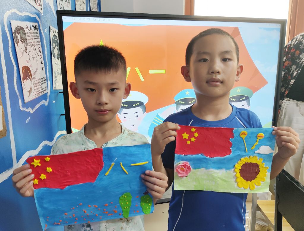 活动中,“平安使者”志愿者为辖区儿童讲解了“八一”建军节的由来,并带领大家制作创意彩泥画,揉、搓、捏、贴…孩子们发挥想象力,给作品搭配了各种元素,每个作品都饱含着孩子们对祖国和军人的美好祝愿和祝福。经过孩子们的认真制作一幅幅红色作品呈现在大家面前,鲜红色的红星闪闪发光,每一幅作品都闪烁着初心使命的光辉。彤彤说:“通过志愿者姐姐的讲解,我切实体会到今天的幸福生活来之不易,正是有了解放军叔叔们的无私奉献,冲锋在前,才有了如今繁荣昌盛的祖国。作为新时代的少年,我们要学习他们的革命精神,将来也要为祖国的发展贡献自己的力量!”