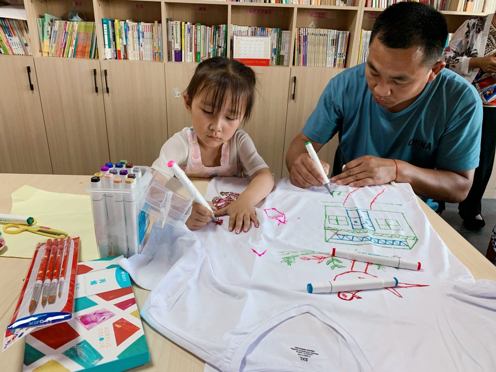 父亲!您是高山,我愿做您身上绿色的植被,让这四季常青的衣衫为您遮风避寒。活动在如火如荼的进行中,有的小朋友看着自己的父亲露出稚嫩的幼牙,尽力画出自己心中那伟岸的父亲形象;有的小朋友要把自己的小手画在自己爸爸的大手旁边,希望一辈子牵着爸爸的手;有的小朋友和爸爸合作绘画了一幅特属于他们的画作。在现场,四位父亲也在热烈的交谈并且“显摆”着自己的衣服,“这件衣服,给我多少钱也不卖,这可是无价之宝啊”“我明天就穿着去上班,让别人都看看我女儿给我画的衣服”“这件衣服我可得收藏起来,等我老了之后再拿出来看看肯定别有一番滋味”。
