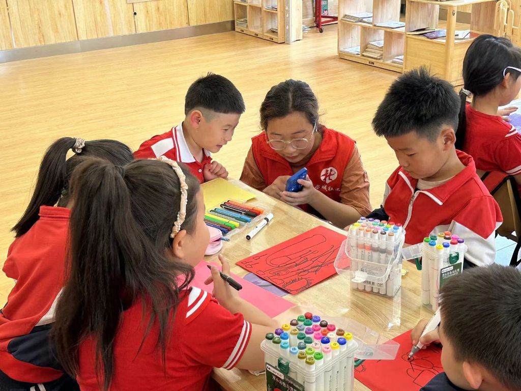 活动开始,社工通过带领小朋友们玩萝卜蹲游戏,让孩子们快速进入温馨快乐的氛围,拉近孩子与社工之间的距离;在做贺卡环节中,孩子们通过基本的剪剪、贴贴、画画等方式,充分发挥自己的想象力,把几张简单的彩纸变成了一张张各具特色的贺卡。由于每个孩子都是不同的,社工尊重孩子们的个性,在此社工扮演“引导者、鼓励者”的角色,以问答的形式与小朋友们互动,耐心倾听小朋友口中的“妈妈”喜欢什么、是什么样子的……引导小朋友明白妈妈在生活中的辛苦和不易,要学会感恩,并在社工及老师的帮助下抒写想对妈妈说的心里话。