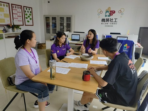 简单的欢迎仪式和自我介绍后,社工与两位小志愿者熟络起来。“你理解中的社会工作是什么呢?”社工抛出了话题。“我认为是做社会中方方面面的工作”“可能就是组织大家一起活动吧,我也不确定”。两位志愿者的描述,其实也是目前社会上大家对社会工作理念和社会工作行业存在的疑惑,于是社工以青少年的学校生活为背景,结合具体案例,从“助人自助,与爱同行”开始讲起。