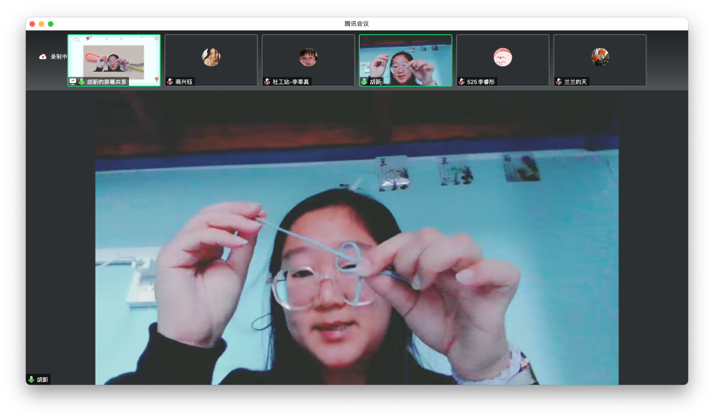 志愿者胡老师由古代中国“结绳记事”引入本次教学,充分利用视频与手动示范相结合的方法,为学生们讲解并演示了十字结和双联结,激发学生的兴趣与积极性。老师有效结合生活实际大家遇到和熟知的中国结类型,赋予中国结活的、有意义的、生活化的深刻内涵。进行教学分解,由易到难,教授简单的中国结编织。同学们亲自加入到课堂中体验制作的快乐,在这个过程中,审视每一个细节,完成每一个打结的步骤,都极大的提升他们的观察力、注意力和动手协作能力。